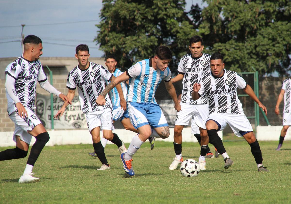 ASEDIADO. Uno de los jugadores de Unión del Norte que rodea al jugador "decano", es Riera (segundo desde la izquierda) FOTO GENTILEZA DE JOSÉ DOMÍNGUEZ