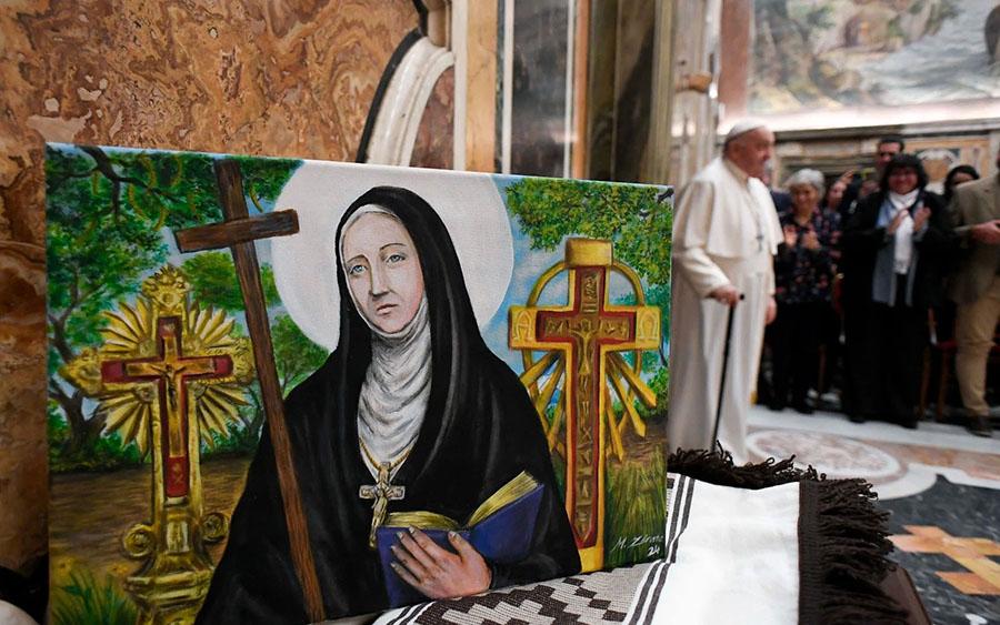 - Santa María Antonia de Paz y Figueroa (Mama Antula, foto de la ceremonia realizada en Roma). Canonizada el 11 de febrero de 2024. Nacida en Santiago del Estero en 1730, fue una laica que continuó la obra de los jesuitas tras su expulsión de América en 1767, organizando ejercicios espirituales y promoviendo la fe en tiempos difíciles para la Iglesia. Su beatificación y canonización fueron impulsadas por Francisco, quien cuando era arzobispo de Buenos Aires ordenó reactivar su causa. Es la primera santa Argentina.