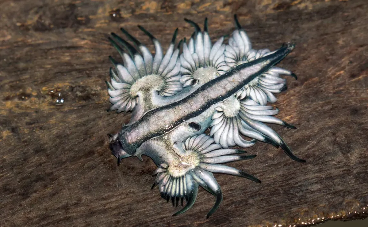 El dragón azul roba células urticantes, llamadas nematocistos, a las carabelas portuguesas y las almacena en órganos especializados situados en las puntas de sus cerata, o alas, lo que explica su nombre. Si se ve amenazado por un depredador, el nudibranquio descarga las células urticantes, explica Valdés.