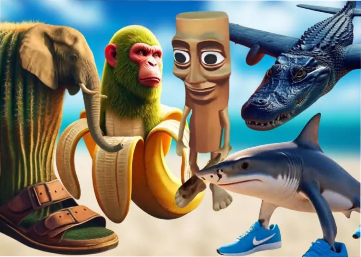 Entre los personajes más conocidos se encuentran, además de este tiburón surrealista, Ballerina Cappuccina , una bailarina que gira y viste tutú con una bebida de café en lugar de cabeza; Lirili Larila, un híbrido de elefante y cactus que camina por el desierto con sandalias estilo Birkenstock; Trippi Troppi, que es mitad gato y mitad pez Bombardiro Crocodrilo (un cocodrilo con partes de un avión de guerra); Tung Tung Tung Sahur (una criatura de madera con un bate de béisbol), y Frigo Camelo (un camello con un refrigerador en la espalda).