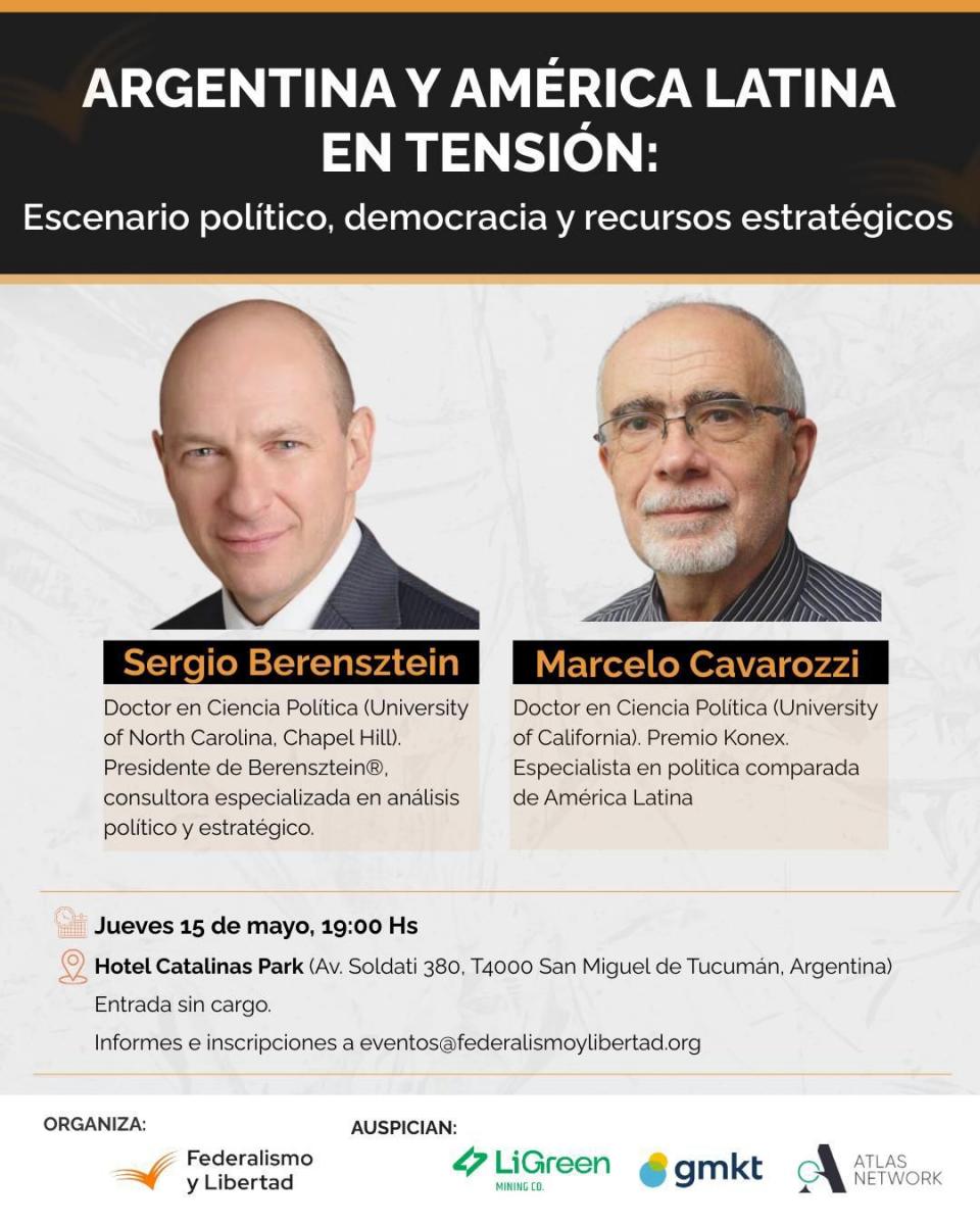 En un contexto de creciente presión sobre los sistemas democráticos y de reconfiguración del mapa político regional, la Fundación Federalismo y Libertad organiza una conferencia clave en Tucumán. El evento, titulado “Argentina y América Latina en tensión: Democracia, recursos estratégicos y nuevas configuraciones políticas”, contará con la participación de dos figuras destacadas del análisis político: Sergio Berensztein y Marcelo Cavarozzi.