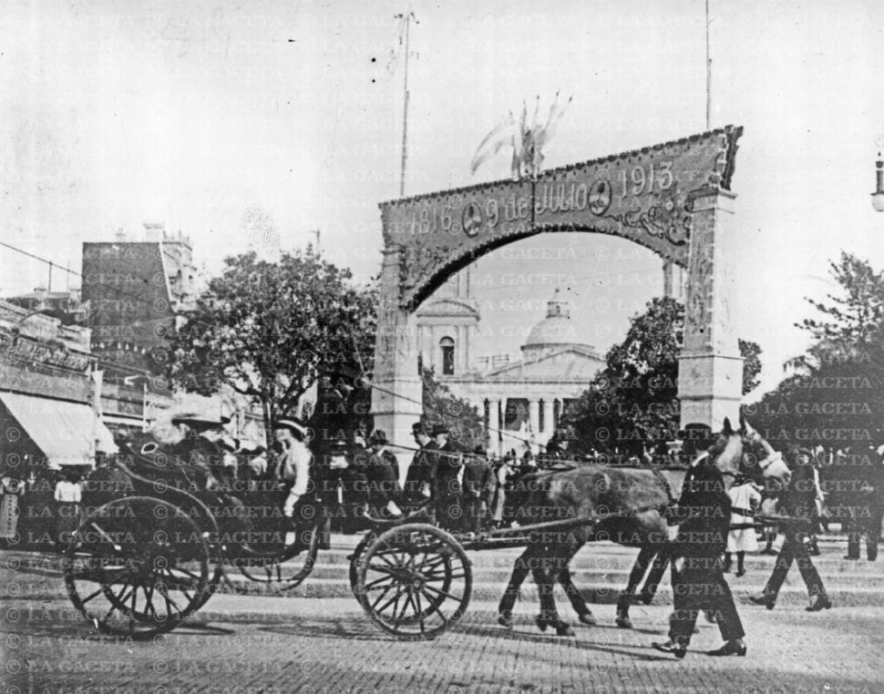 Tiempo atrás, el lugar de concentración de las miradas siempre eran las plazas y, por lo general, la plaza principal. Por eso la mayoría de las fotos que nos golpean la puerta de esta sección suelen estar a la vuelta de la plaza Independencia. Ese era -y es, aunque en menor medida- el lugar de encuentro, de diálogo, de presumidas y de protestas. En esta imagen rescatada del Tucumán de 1913 se ve el paseo concurrido por caminantes y por quienes se trasladan en los vehículos de la época, como el carruaje, que aparece en primer plano circulando por la calle Las Heras. Ese era el nombre que en aquel entonces tenía la actual calle San Martín. Al fondo, casi encuadrada por el arco que se armó en la plaza, se ve la Catedral.