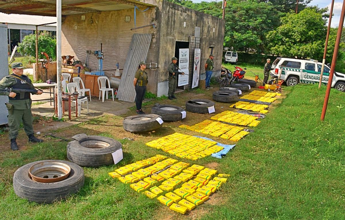 Una de las inspecciones tuvo lugar en una finca ubicada sobre la Ruta Nacional N° 34, de la localidad de General Mosconi. Allí, dentro de una gomería abandonada, los gendarmes hallaron 400 paquetes rectangulares acondicionados dentro de siete cubiertas de camión. Las pruebas de Campo Narcotest realizadas por personal de Criminalística y Estudios Forenses confirmaron que se trataba de cocaína, con un peso total de 425 kilos 975 gramos.
