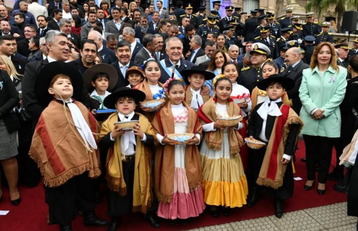El gobernador Osvaldo Jaldo, junto al vicegobernador Miguel Acevedo, encabezó la ceremonia oficial que dio inicio con el tradicional chocolate patrio, compartido entre cientos de vecinos y vecinas que se acercaron a vivir la conmemoración desde temprano. Luego prosiguió con el Tedeum en la Catedral.