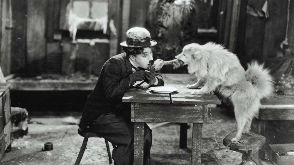 PERRO FAMOSO. Chaplin lucha con un pastor alemán por un pedazo de comida en “La quimera del oro”.