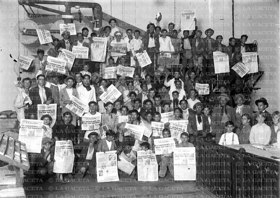 Un nutrido grupo de canillitas visitan LA GACETA luego de solucionar un conflicto con una empresa periodística local (sic). Esta foto fue publicada el 2 de abril de 1930 y en ella los vendedores de diarios muestran una tapa con los titulares de la edición del día anterior, el 1 de abril, con la información de un tremendo accidente de tren en Metán que dejó tres muertos.
