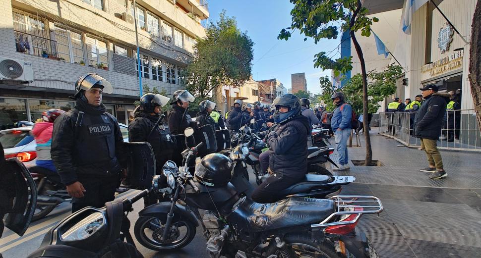 Según cuentan los choferes, mientras estaban en el parque, la Policía intervino para tratar de limitar el número de motocicletas que llegaría al Concejo para que no se vea afectado el tránsito. Al llegar al centro, las motos fueron estacionándose sobre el carril exclusivo de colectivos, con una hilera de oficiales del Grupo de Operaciones Motorizadas de Tucumán (GOMT) parados sobre la línea amarilla que divide la calzada, impidiendo el corte total de la calle Monteagudo. Con el paso de las horas, los vehículos de dos ruedas fueron desplazados hacia la vereda.