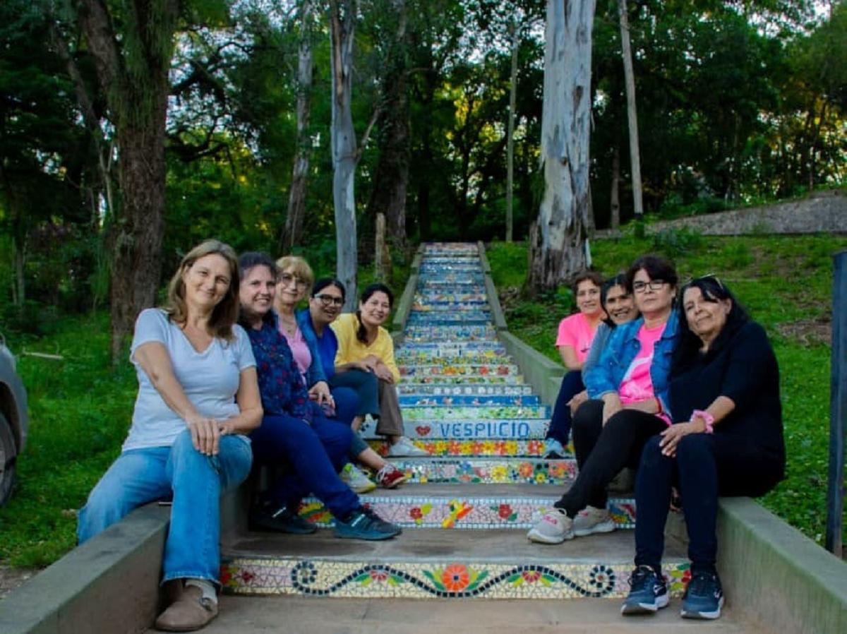 La abundante belleza natural de uno de los lugares mágicos de la provincia de Salta emplazado en la biósfera de las yungas, Campamento Vespucio, logra prevalecer por su contundencia verde y su follaje, a pesar de los recientes impactos debido a los cambios climáticos, la deforestación y la falta de conciencia ecológica por parte de las grandes empresas que supieron explotar la zona en tiempos no tan lejanos. La exuberancia de la flora nativa responde al colorido local: un domingo 30 de mayo en horas de la tarde, una caravana de vehículos y motos, gente en bicicletas o a pie, siguen una imagen del Sagrado Corazón de Jesús (santo patrono de Campamento Vespucio) que será entronizado esta fecha para dar paso a la celebraciones religiosas de costumbre, que ahora conviven con el ciclismo y el turismo natural, el avistaje de aves y el trekking. En frente de la capilla de la localidad, sobresale a la vista un fenómeno infrecuente que, sin embargo, no altera el paisaje sino que lo resignifica. Hace dos años, un grupo de mujeres lideradas por la Lic. María Brunet e integrado tanto por mosaiquistas con experiencia como artistas plásticas sin conocimiento de la técnica, además de otras vecinas y amigas, decidieron -una elección basada en el espíritu libre de curiosidad y creatividad, pero también movido por un afecto y sentido de pertenencia para con su lugar- intervenir una de las escaleras que se encuentran en el ángulo derecho de una subida lateral, que dan acceso a la calle superior. Entre charlas y limpiezas regulares, las miembros de este colectivo coordinaron una expresión duradera de una obra al aire libre, así como dieron luz y color a una de los primeros antecedentes de intervenciones en espacios comunitarios con el propósito de revalorizar el patrimonio cultural.