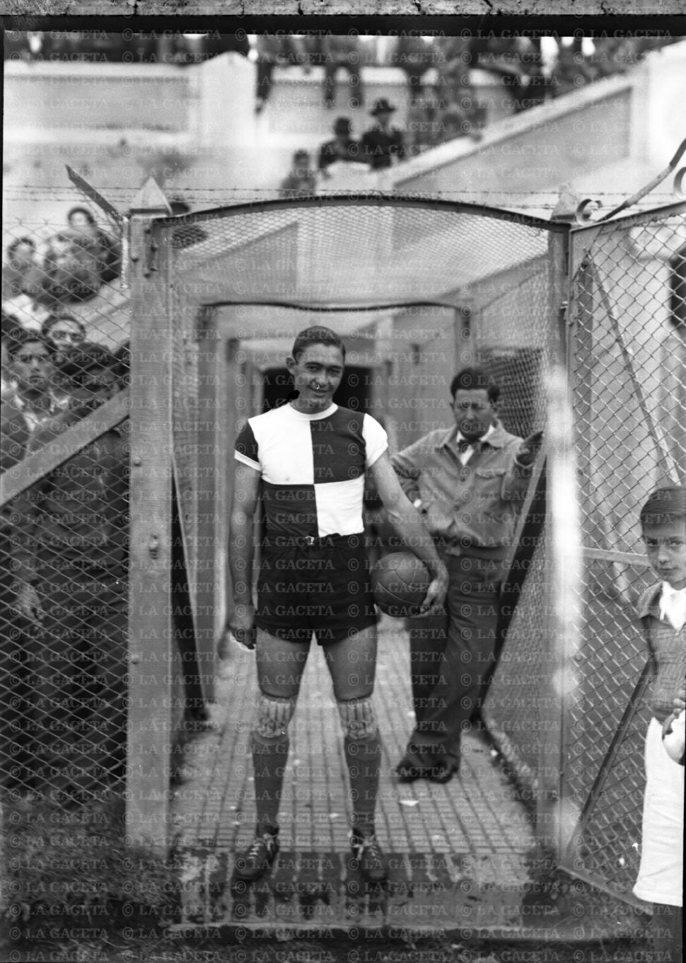 Entra al campo de juego el arquero de San Martín. Es la cancha de Atlético Tucumán, y la figura que lleva la pelota es Clemente Vissi, guardametas en la década del 30 y principios de los 40. En la imagen seleccionada por Jorge Olmos Sgrosso se puede apreciar, además de la imagen impecable del arquero con botines, short, media y rodilleras y peinado a la gomina, el público de época, con sombreros , saco y corbata, llenando las gradas del estadio, así la protección que había en el túnel de salida de los jugadores. También, un niño que mira a la cámara que inmortaliza la escena. Vissi, además de arquero, era taxista.