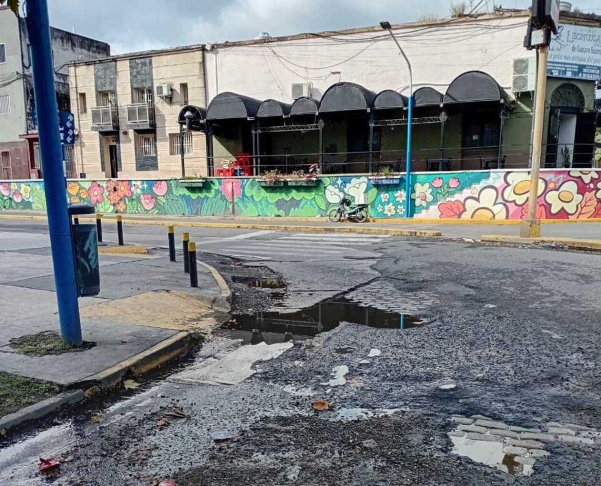 Son muy bonitos y coloridos los murales pintados en la esquina de 24 de Septiembre y Marco Avellaneda. El problema radica en el pavimento, totalmente destruido en la ochava adyacente a la plazoleta “Enrique Telfener”. Autos, motos, ómnibus y bicicletas son las víctimas de ese archipiélago de cráteres, que desde su aparición hace largo tiempo no paran de crecer.