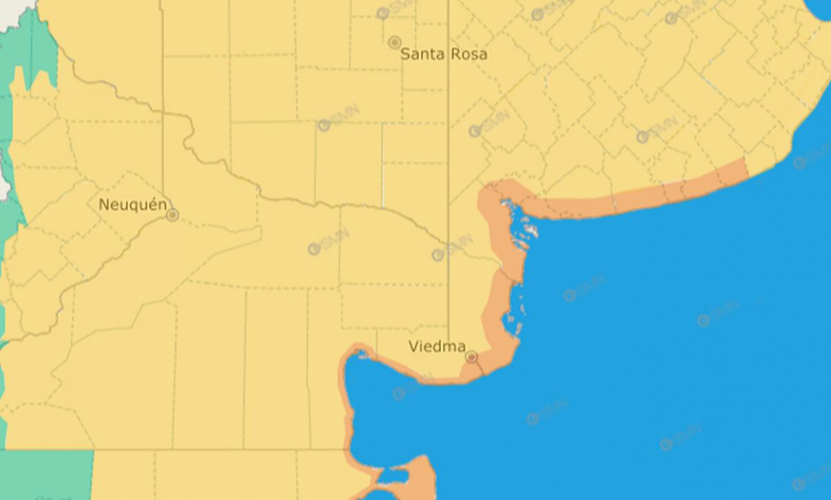 Hacia la Patagonia están en alerta amarilla Neuquén y Río Negro –a excepción de la zona de la cordillera–, y el uarto noreste de Chubut. La alerta naranja se repite en la costa de esta última provincia.