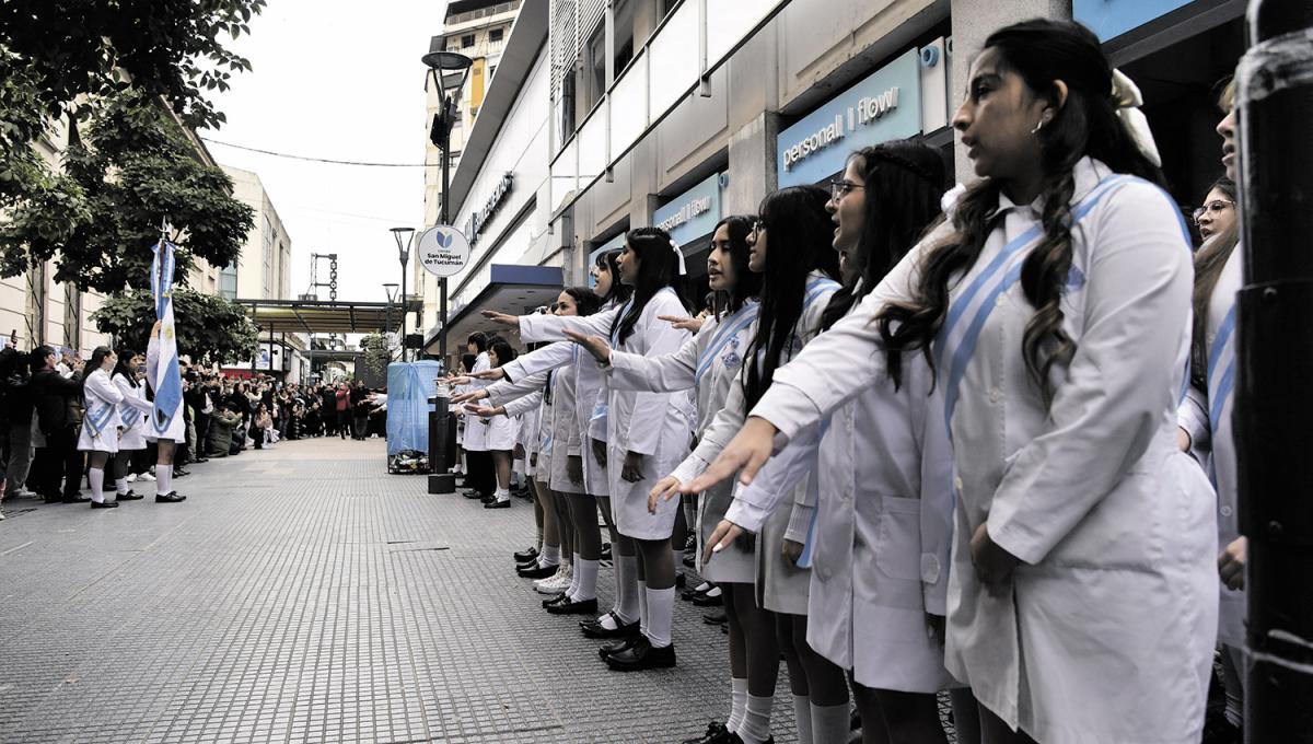 El cuarto año de los profesorados de Lengua y de Economía del Instituto General San Martín renovaron su promesa a la bandera el jueves pasado a la tarde. Fueron acompañados por la Banda de Música de la Policía de Tucumán y por los cadetes del Instituto de Enseñanza Superior de la Policía, que hicieron las destrezas protocolares y disparos con balas de salva en el acto que ocupó durante 15 minutos la calle 25 de Mayo cerca de la esquina con San Juan.