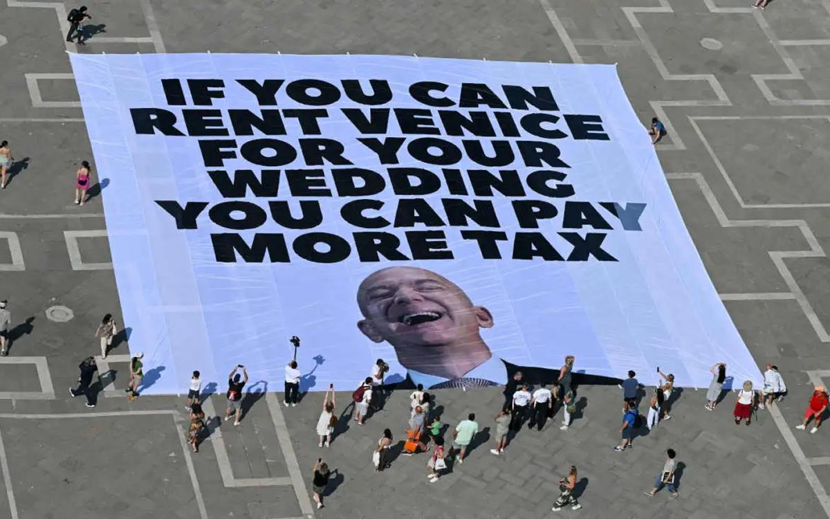 Pancartas con el lema "No hay espacio para Bezos" y otras que decían "Si puedes alquilar Venecia para tu boda, puedes pagar más impuestos" fueron desplegadas para cuestionar el estilo de vida insostenible de los superricos. Los activistas argumentan que Venecia no debería ser vista como un "parque temático" alquilable para fiestas privadas de multimillonarios.