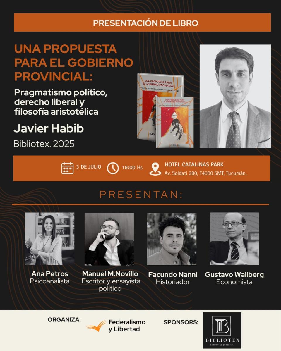 La Fundación Federalismo y Libertad anunció la presentación del libro Una propuesta para el gobierno provincial: Pragmatismo político, derecho liberal y filosofía aristotélica, del Dr. Javier Habib. El evento se llevará a cabo el jueves 3 de julio a las 19 en el Salón “Bolívar” del Hotel Catalinas Park (Av. Soldati 380, San Miguel de Tucumán), con entrada libre y gratuita, previa inscripción.