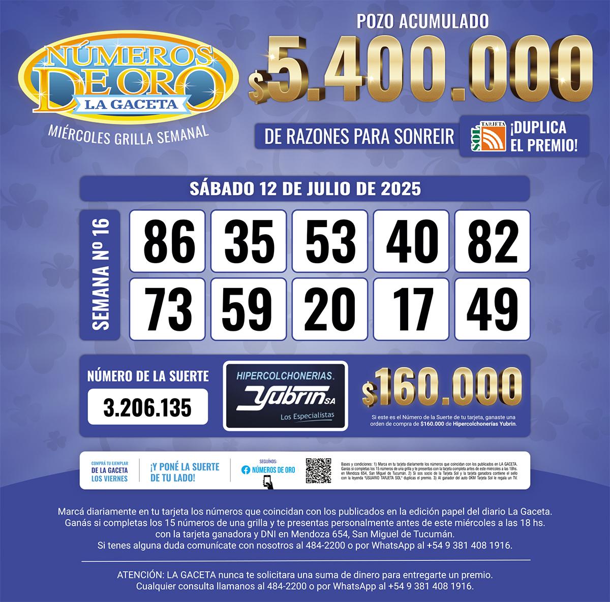 Los Números de Oro de LA GACETA del 12 de julio de 2025