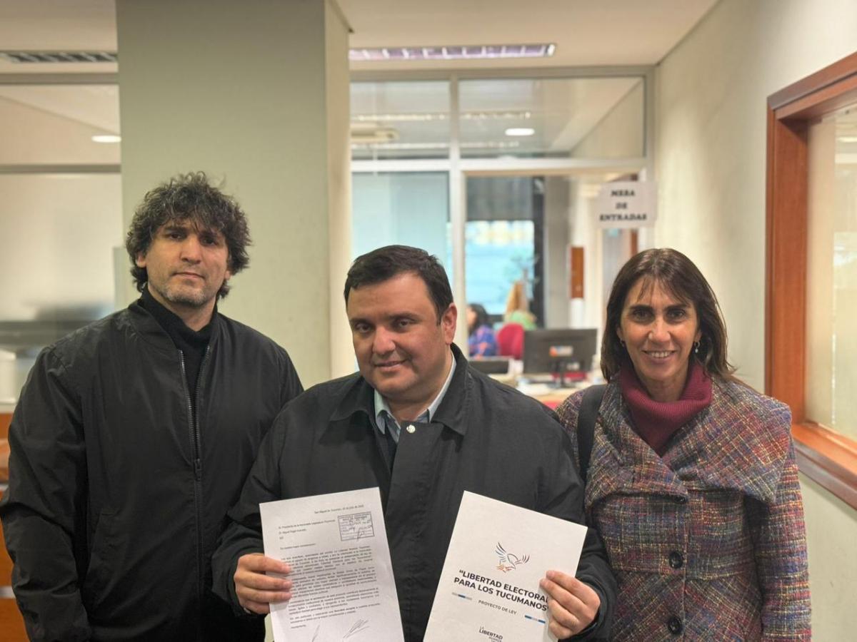 La vicepresidente del partido La Libertad Avanza Tucumán, Soledad Molinuevo, acompañada por el diputado nacional Gerardo Huesen y Manuel Guisone, acercó a la Legislatura el proyecto de reforma electoral, considerado como "la madre de todas las batallas" por el vicejefe de Gabinete del Interior, Lisandro Catalán.