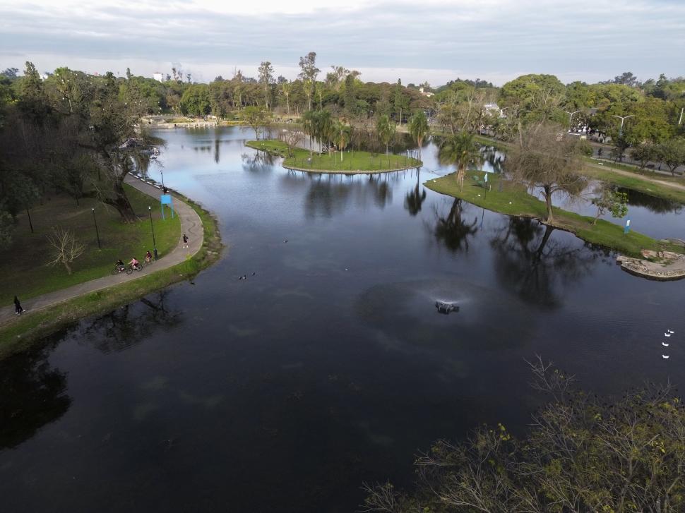 PANORÁMICA. Estiman que demorarán alrededor de 20 días en limpiar completamente la mancha provocada por los litros de aceite de las frituras arrojados al lago San Miguel luego de los festejos del 20 de julio. La Gaceta / Foto de Matías Vieito