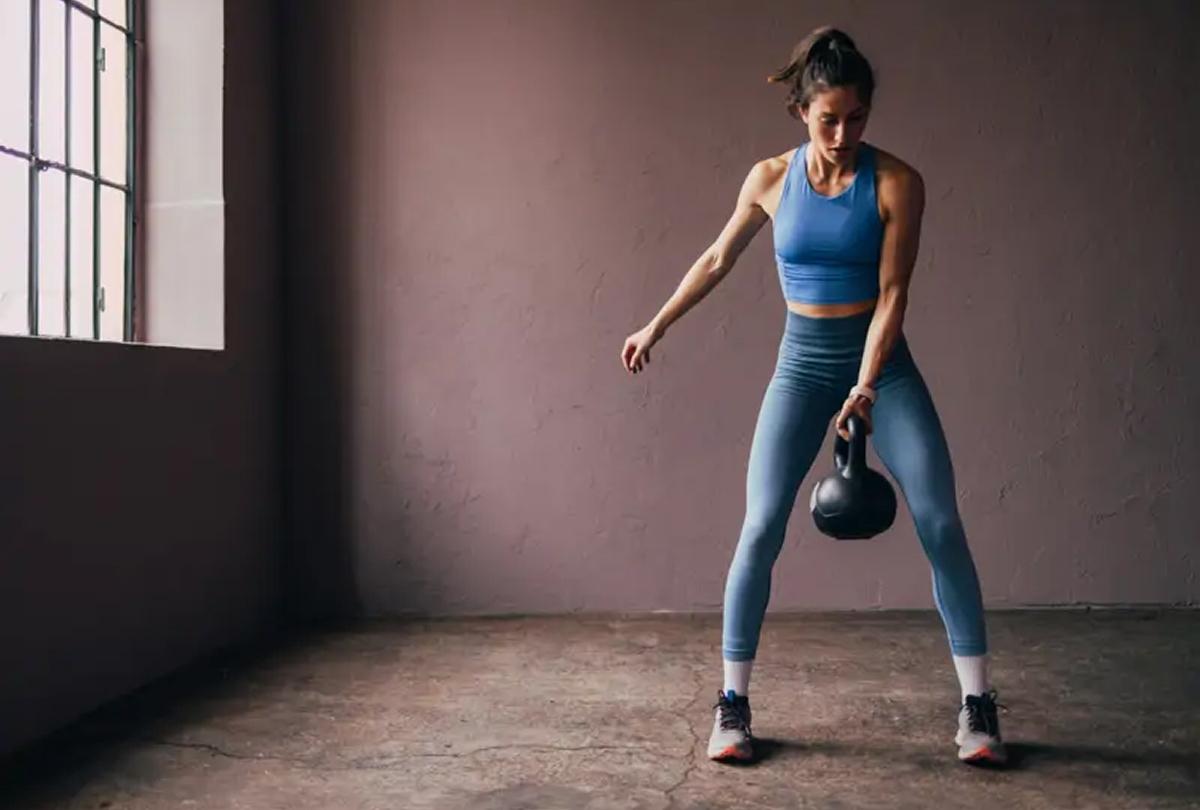 Otro ejercicio para el que utiliza la pesa rusa es para hacerla girar en torno a su cuerpo. Para ello, la pasa de una mano a la otra con transiciones fluidas para que no pare el movimiento. El ejercicio ayuda al core y a los oblicuos.