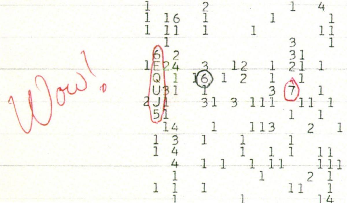 El 15 de agosto de 1977, el radioastrónomo Jerry Ehman estaba revisando una vasta cantidad de datos del radiotelescopio Big Ear, buscando transmisiones de civilizaciones extraterrestres que se comunicarían en el espectro del hidrógeno. El observatorio, ubicado en Ohio, estaba en ese momento escuchando señales provenientes de una región del cielo en la constelación de Sagitario, cerca del cúmulo globular M55. Cuando Ehman se encontró con la secuencia "6EQUJ5", que representaba cómo la señal se intensificaba (del 6 al U, la más alta registrada) y luego se debilitaba (hasta el 5) a medida que la antena del Big Ear barría la ubicación de la fuente, su singularidad lo impulsó a rodearla y escribir su famosa exclamación en rojo: "Wow!".