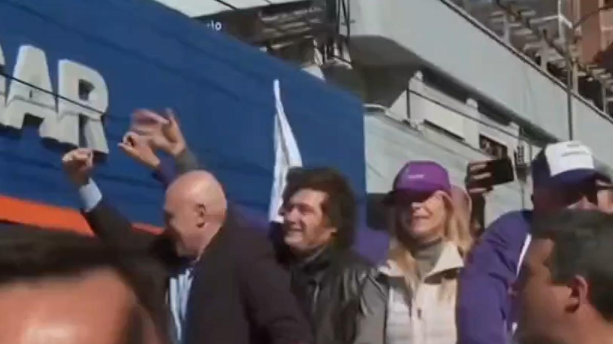 Milei estuvo acompañado por su hermana, Karina Milei, y el diputado nacional José Luis Espert, mientras avanzaba por la avenida Hipólito Yrigoyen saludando a los simpatizantes desde una camioneta blanca. Sin embargo, a pocos metros de allí, un grupo de personas comenzó a lanzar insultos y objetos contundentes.