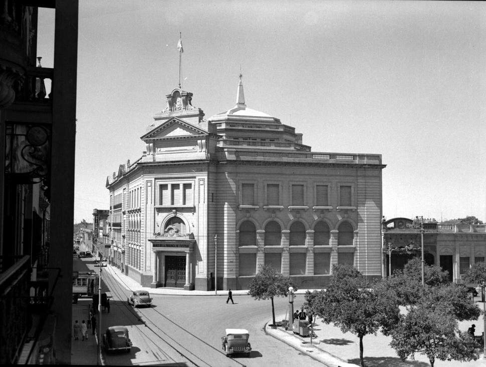 En la imagen del Banco provincia a mediados de los años 30 se distingue el tránsito al revés en la calle Las Heras (hoy San Martín) en la esquina con Laprida.