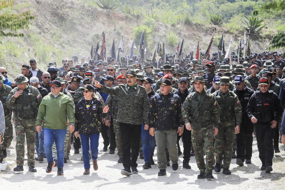 MILICIAS. Maduro y sus ministros recorren un campo de entrenamiento.