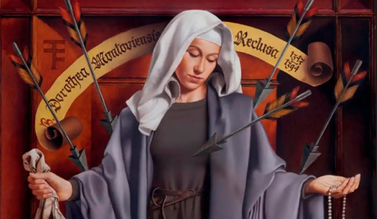 Santa Dorotea de Montau: mística alemana del siglo XIV que vivió como reclusa en una celda junto a la catedral de Marienwerder, entregando su vida a la oración. Dorotea de Montau, nacida en 1347 en la actual Polonia, creció en un hogar profundamente piadoso y desde niña mostró inclinaciones espirituales que sus hermanos desoyeron, casándola con un fabricante de armas. Su vida matrimonial estuvo marcada por el sufrimiento: un esposo hostil a su fe, los golpes, las privaciones y la temprana muerte de casi todos sus hijos. Sin embargo, Dorotea supo transformar el dolor en oración, ayuno y entrega a los pobres, hasta lograr incluso la conversión de su marido antes de que este falleciera.