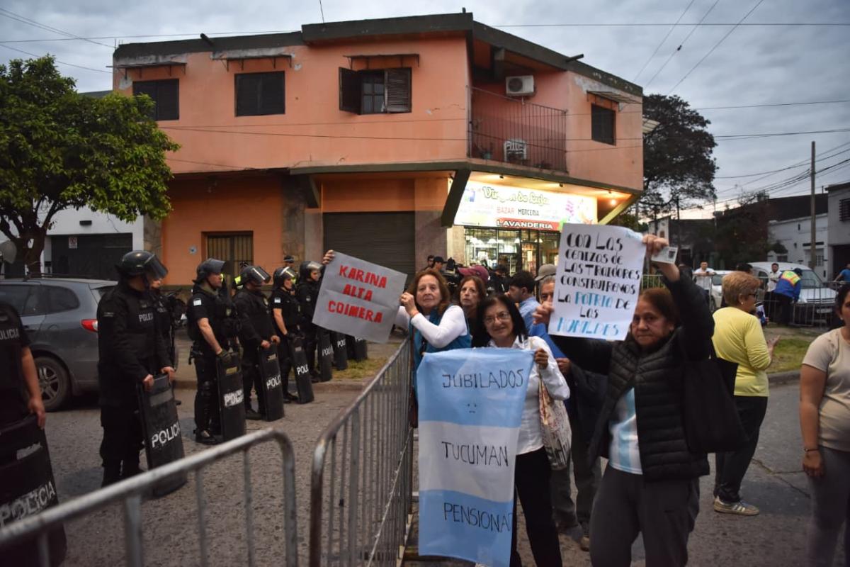 PROTESTA. Jubilados y familiares de personas esperaron a Karina Milei en Villa Luján con pancartas y reclamos FOTOS LA GACETA/OSVALDO RIPOLL