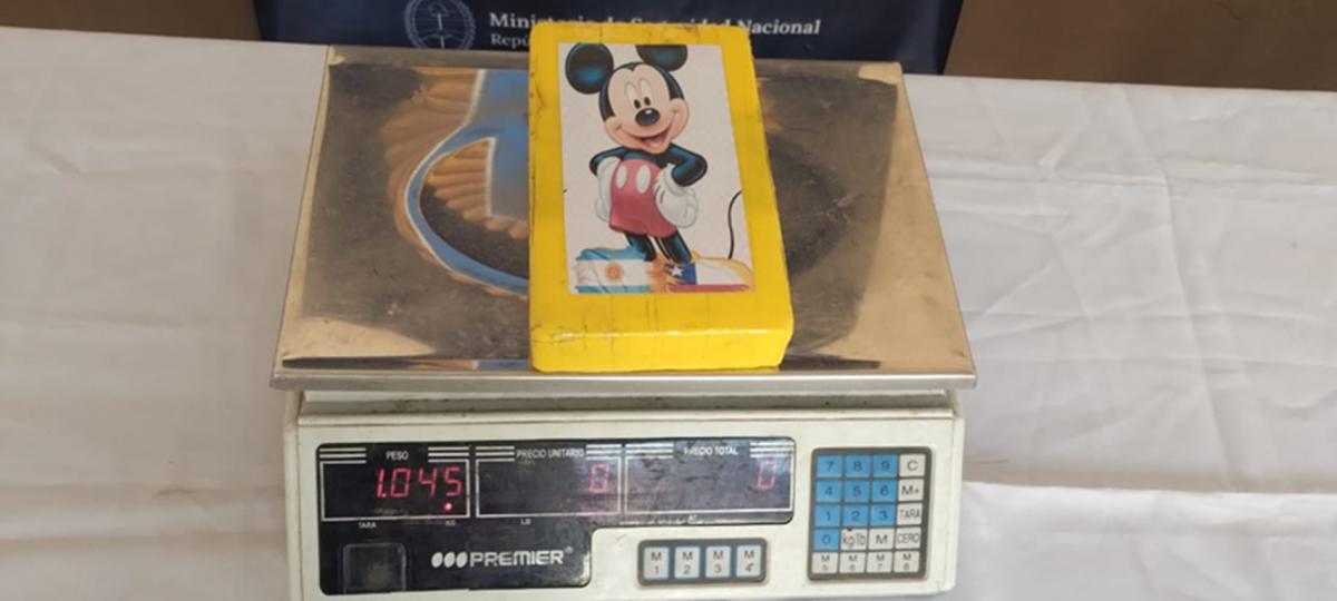 Ante esta actitud, se le solicitó descender del vehículo para realizar una revisión más detallada. En ese momento, los agentes notaron un bulto de gran tamaño que sobresalía entre su ropa. Ahí se efectuó una requisa superficial que permitió extraer de su cintura un paquete rectangular de color amarillo, con una etiqueta con la imagen de “Mickey Mouse”.