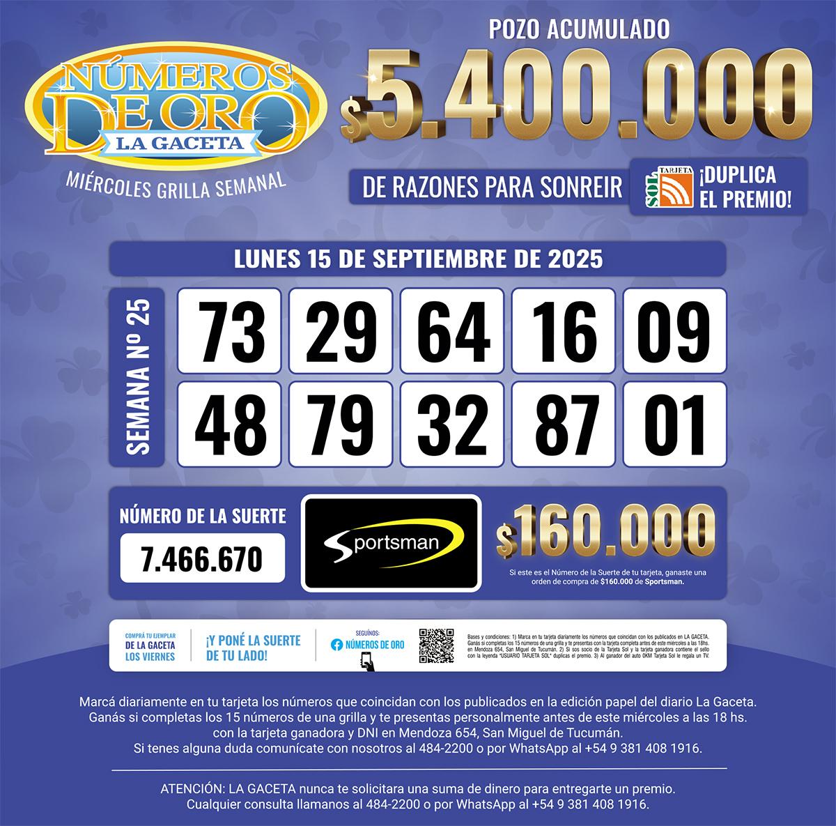 Los Números de Oro de LA GACETA del 15 de septiembre de 2025
