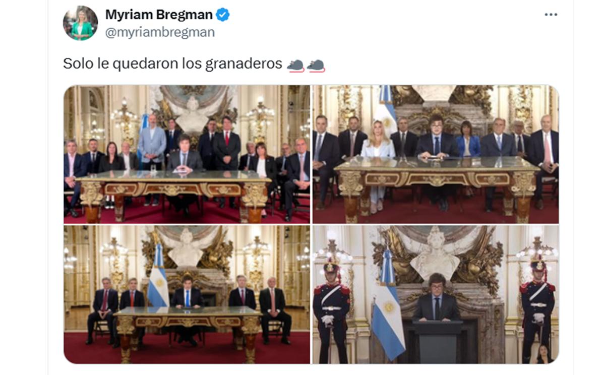 En la misma línea, Myriam Bregman también se expresó en la red social X. En un mensaje con ironía, comentó el dispositivo de grabación presidencial: “Solo le quedaron los granaderos”, escribió junto a fotos de diferentes discursos donde se observa la disminución de funcionarios en escena. Minutos más tarde, lanzó otra crítica: “Sueldo congelado significa vivís de otra cosa, digo, no sé, o sea”.