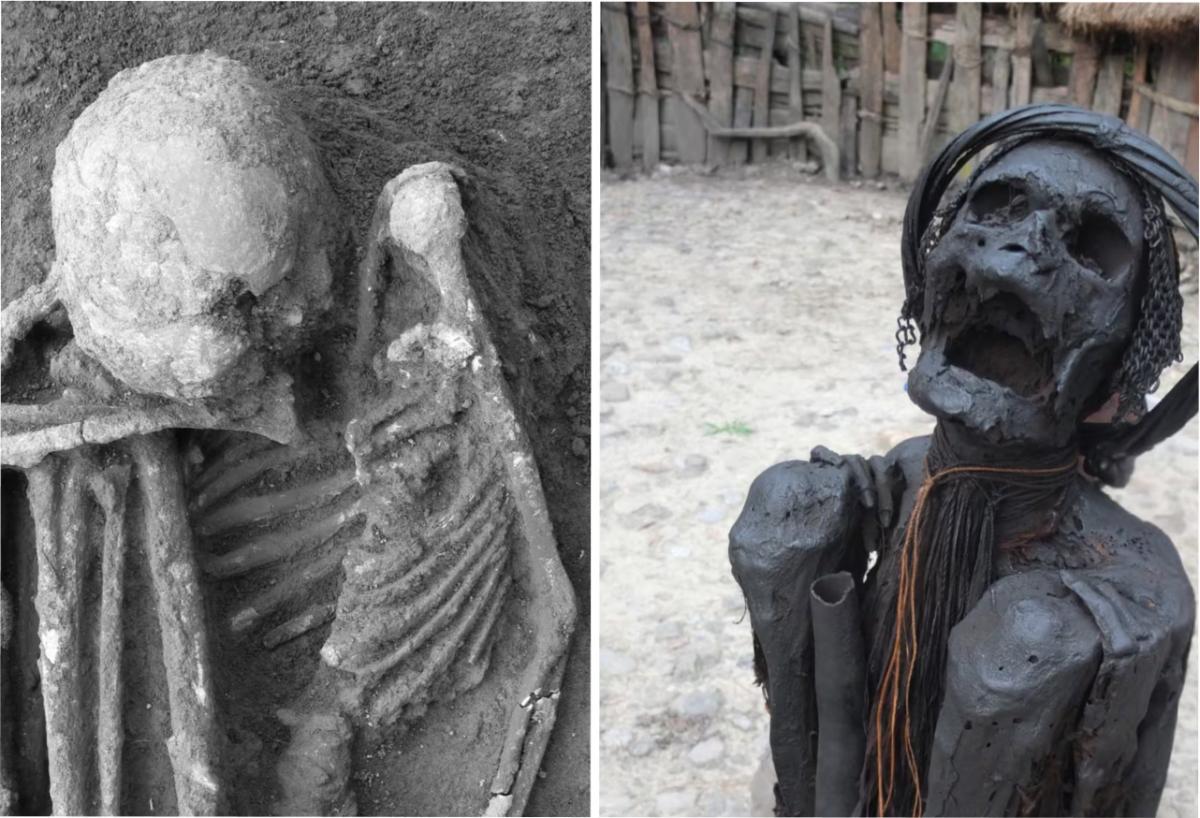 Hallaron las momias más antiguas en el sudeste asiático. Izquierda, la momia de un hombre de mediana edad, A la derecha, momia moderna perteneciente al pueblo dani. Credito Hirofumi Matsumura, Hsiao-chun Hung, Yousuke Kaifu (revista PNAS)/ El País