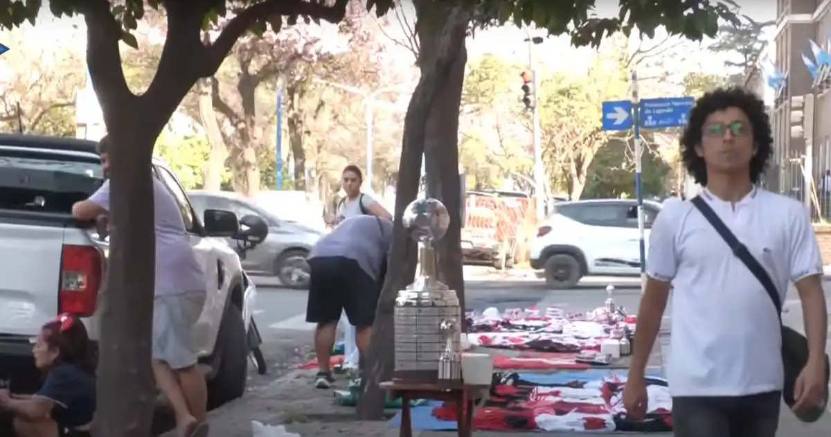 El clima en la puerta de la Liga mezclaba camisetas, banderas, puestos de merchandising y hasta la posibilidad de sacarse una foto con una réplica de la Copa Libertadores. Ariel, un vendedor llegado desde Buenos Aires, ofrecía camisetas retro a 25.000 pesos y explicaba que seguir al equipo también es un modo de vida: “Es prácticamente un trabajo, hay un mercado que abastecer. Hoy de River, mañana de Atlético, del que dé plata”, ironizó entre risas.
