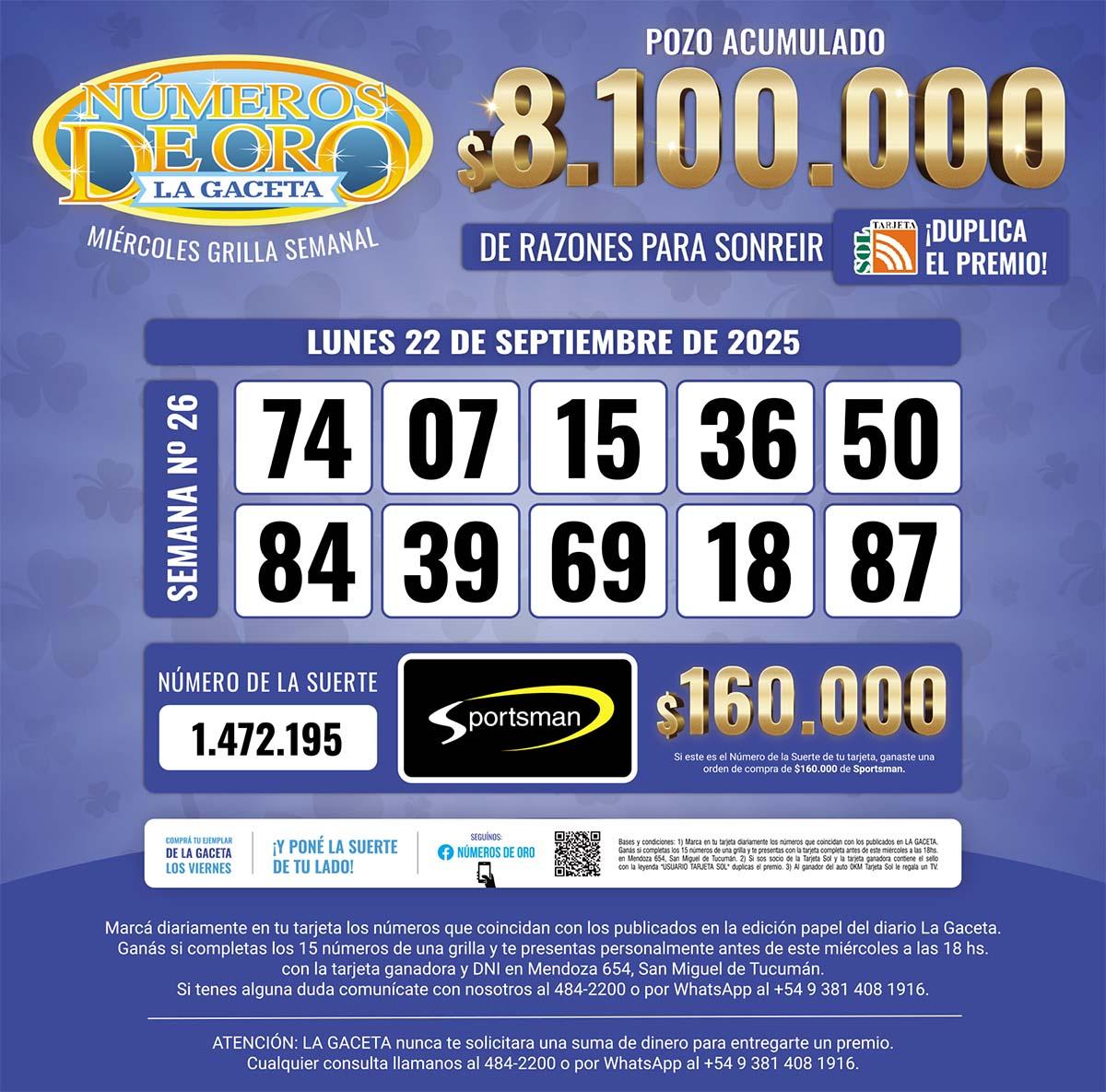 Los Números de Oro de LA GACETA del 22 de septiembre de 2025