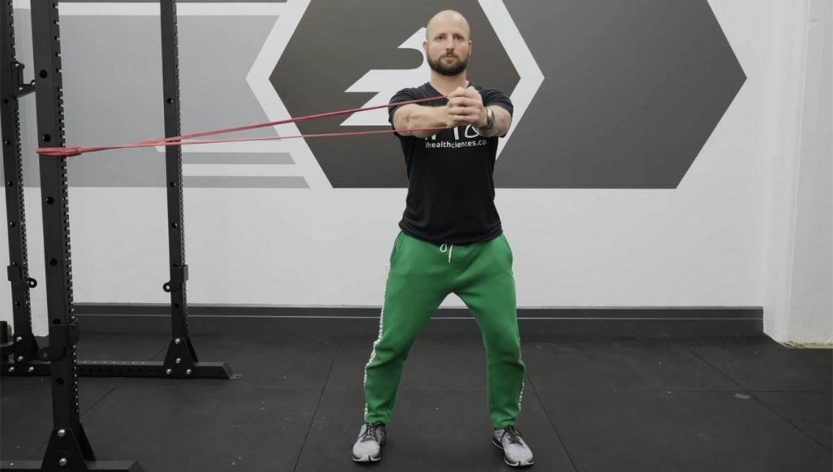Se requiere una banda elástica atada a un punto fijo. De pie y de lado a la goma, se gira el torso en dirección contraria, manteniendo los brazos semiflexionados. Se aconseja realizar entre 12 y 15 repeticiones por lado.
