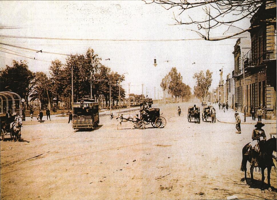 Se ven aquí cuatro coches “victoria”, una bicicleta, un transeúnte y un hombre a caballo. Y ya aparece un tranvía eléctrico, servicio que había sido inaugurado en 1910 y que comenzaba a marcar el cambio en el sistema.