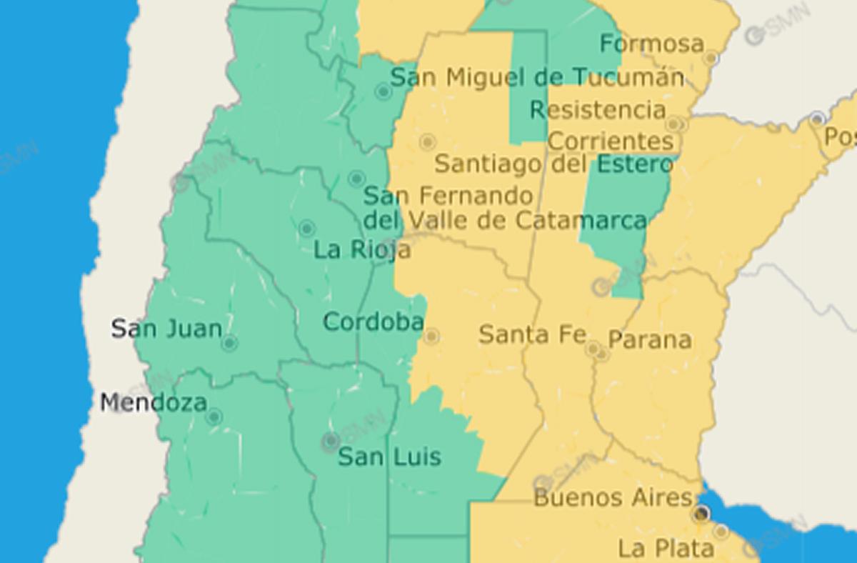 En un análisis proporcional del mapa que publicó el Servicio Meteorológico Nacional se detectó que el 46.6% del país se encuentra bajo alerta amarilla. El aviso implica que hay zonas para las que se pronosticaron posibles fenómenos meteorológicos con capacidad de daño y riesgo de interrupción momentánea de actividades cotidianas.