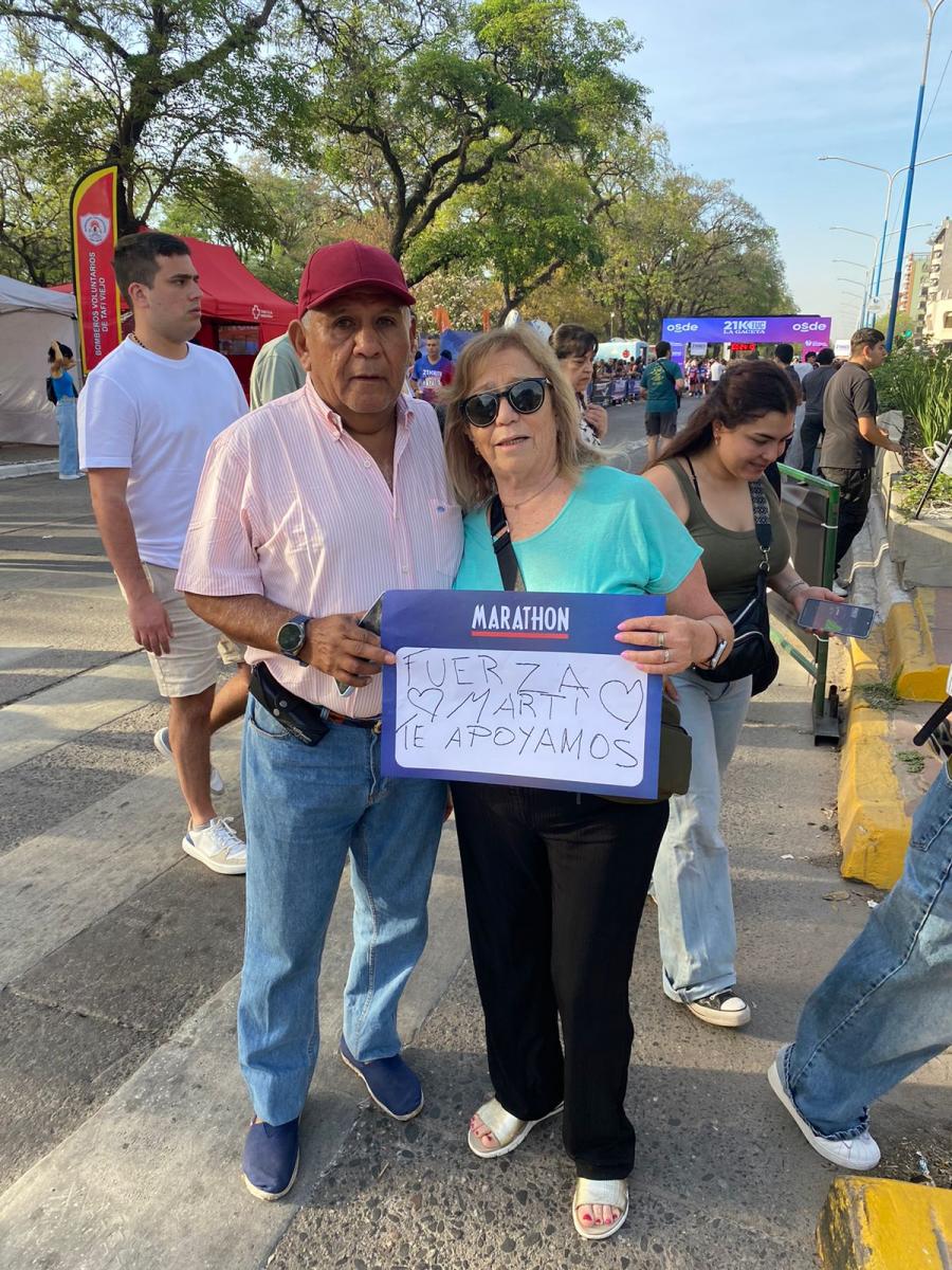 El parque 9 de Julio se llenó de aplausos, risas y emoción durante los 21K LA GACETA, una jornada que reunió a familias enteras alrededor del deporte. Entre los cientos de carteles y banderas que alentaban a los corredores, uno en particular llamaba la atención: “¡Fuerza, Marti. Te apoyamos!”. Detrás de ese mensaje estaban Alicia Taboada y su esposo Santiago Arias, llegados especialmente desde Metán para acompañar a su hija en un día muy especial.
