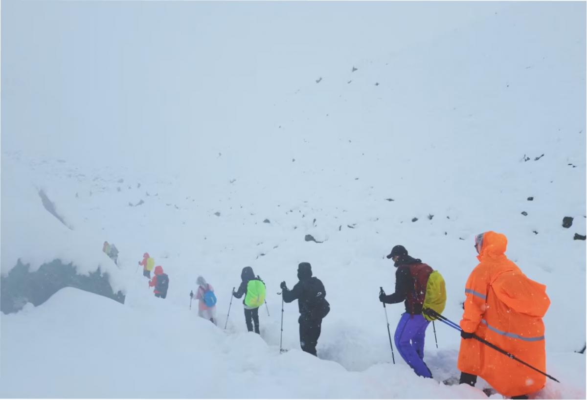 Una captura de pantalla de un video muestra a los excursionistas abandonando su campamento, mientras nevadas y lluvias inusualmente intensas azotaban el Himalaya, en la región del Tíbet, China, el 5 de octubre de 2025. Geshuang Chen/vía Reuters/ABC News