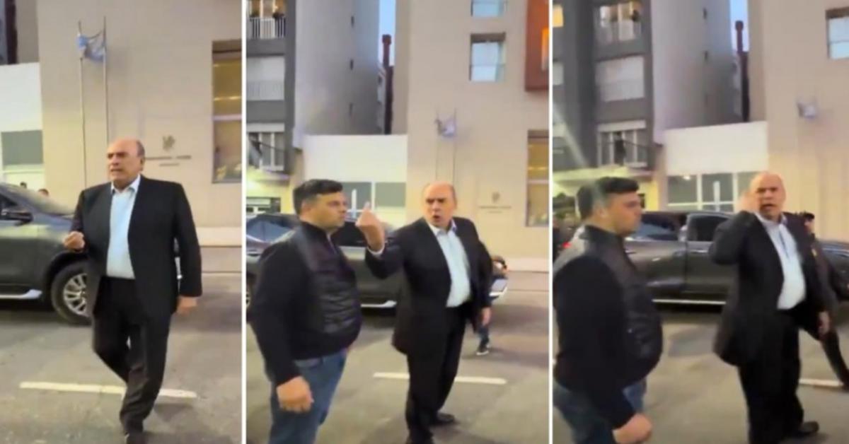 Un manifestante, vestido con buzo gris, se emplazó sobre una valla, detrás de la cual comenzó a increpar a Francos, a la distancia. Los videos que se difundieron comienzan justamente allí, cuando el jefe de ministros desciende de la camioneta y se acerca al manifestante.