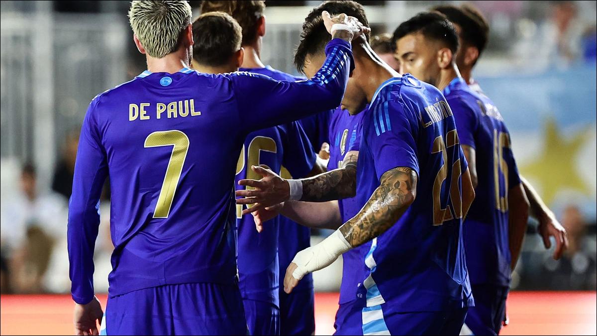 Emiliano "Dibu" Martínez; Gonzalo Montiel, Leonardo Balerdi, Nicolás Otamendi, Nicolás González; Rodrigo De Paul, Alexis Mac Allister, Giovani Lo Celso, Giuliano Simeone; Lionel Messi y José López.