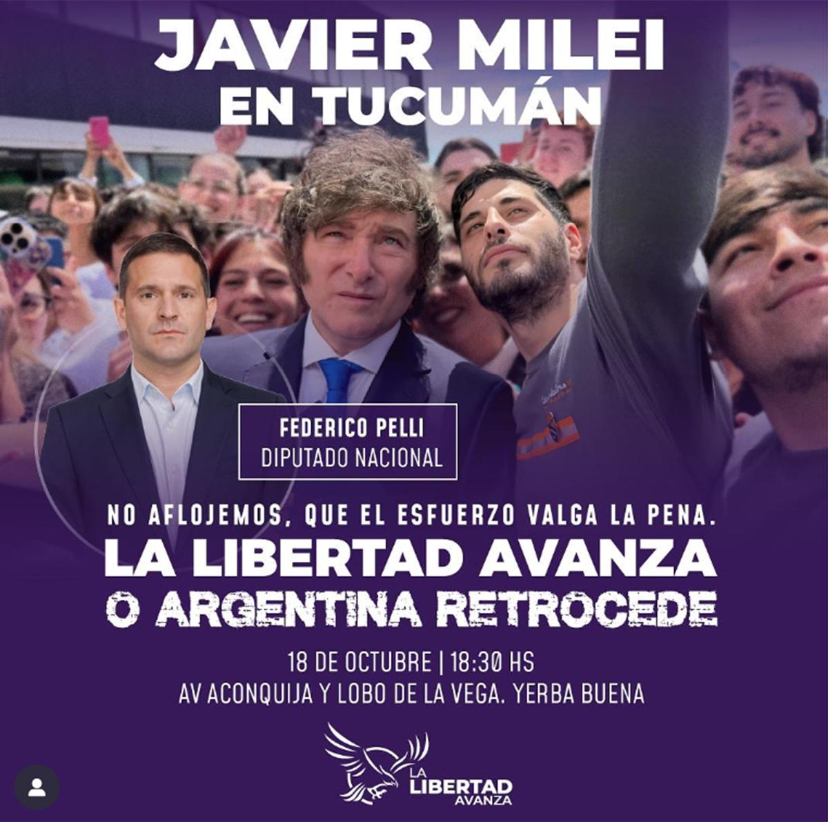 “Javier Milei viene a Tucumán a apoyar a Federico Pelli. No aflojemos. Que el esfuerzo valga la pena. La Libertad Avanza o Argentina retrocede”, remarcó LLA.