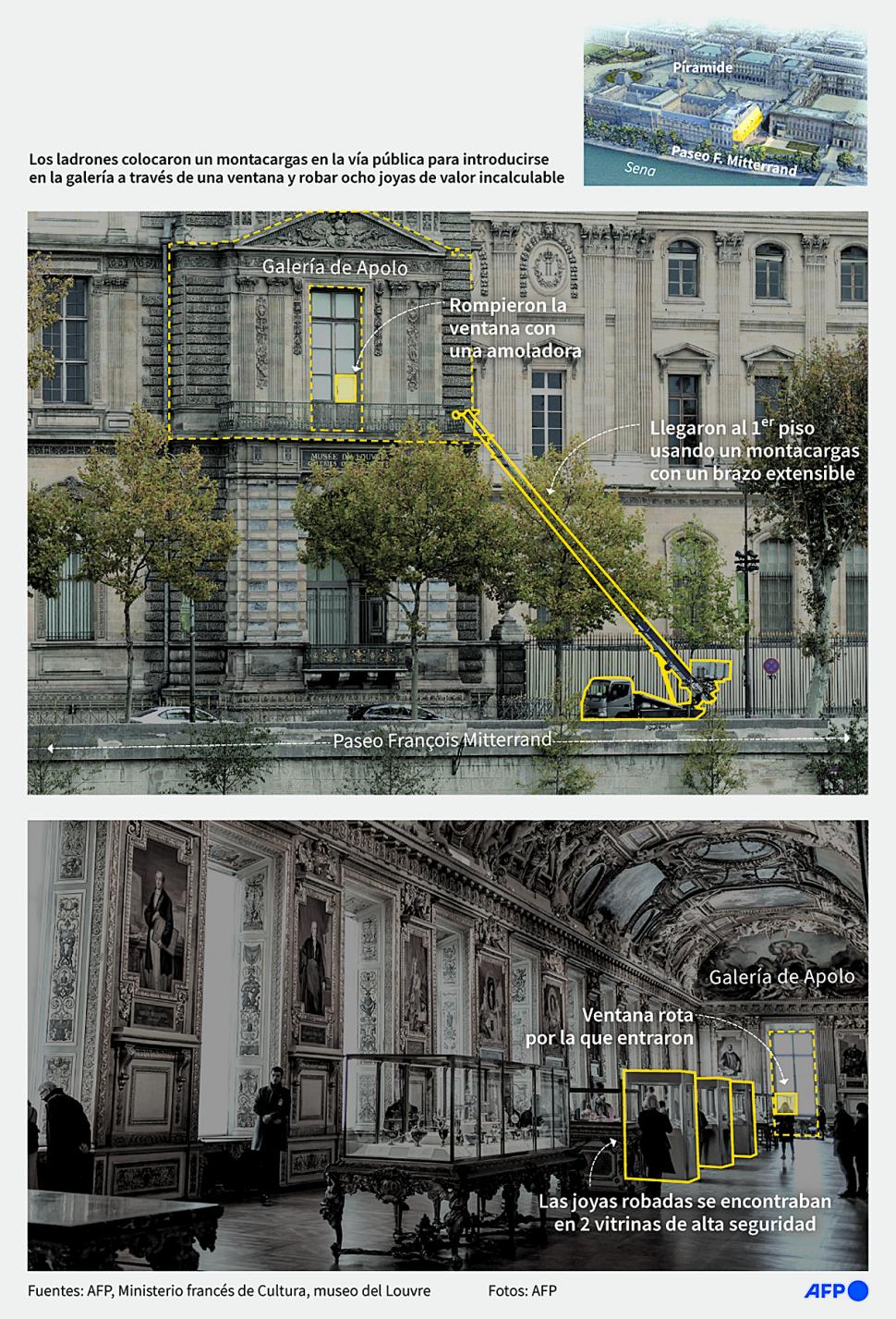UN ATAQUE AL CORAZÓN DE FRANCIA. Los ladrones colocaron un montacargas en la vía pública para introducirse en la galería a través de una ventana y robar ocho joyas de valor incalculable.