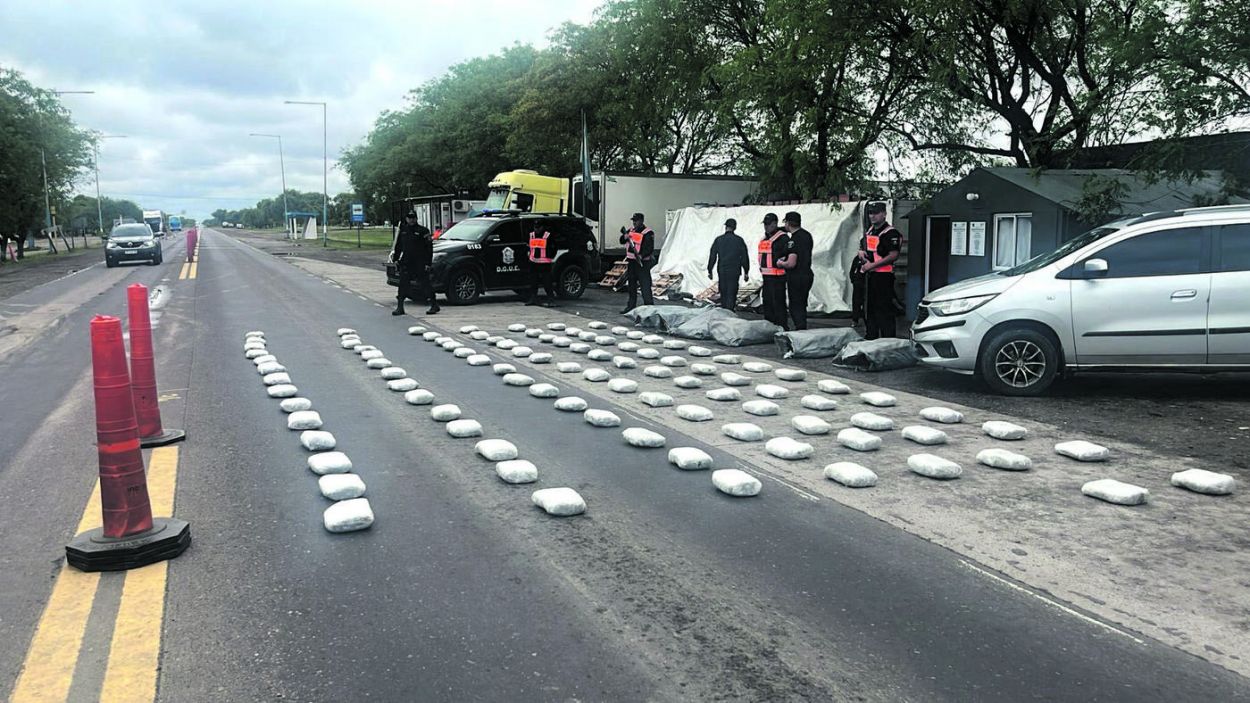 Los pesquisas revisaron los bultos que traían y descubrieron que en su interior había unos 100 paquetes que tenían un peso total de 108 kilos. En el interior del vehículo encontraron una pistola y descubrieron que el vehículo había sido denunciado como robado en la localidad de La Matanza, provincia de Buenos Aires.