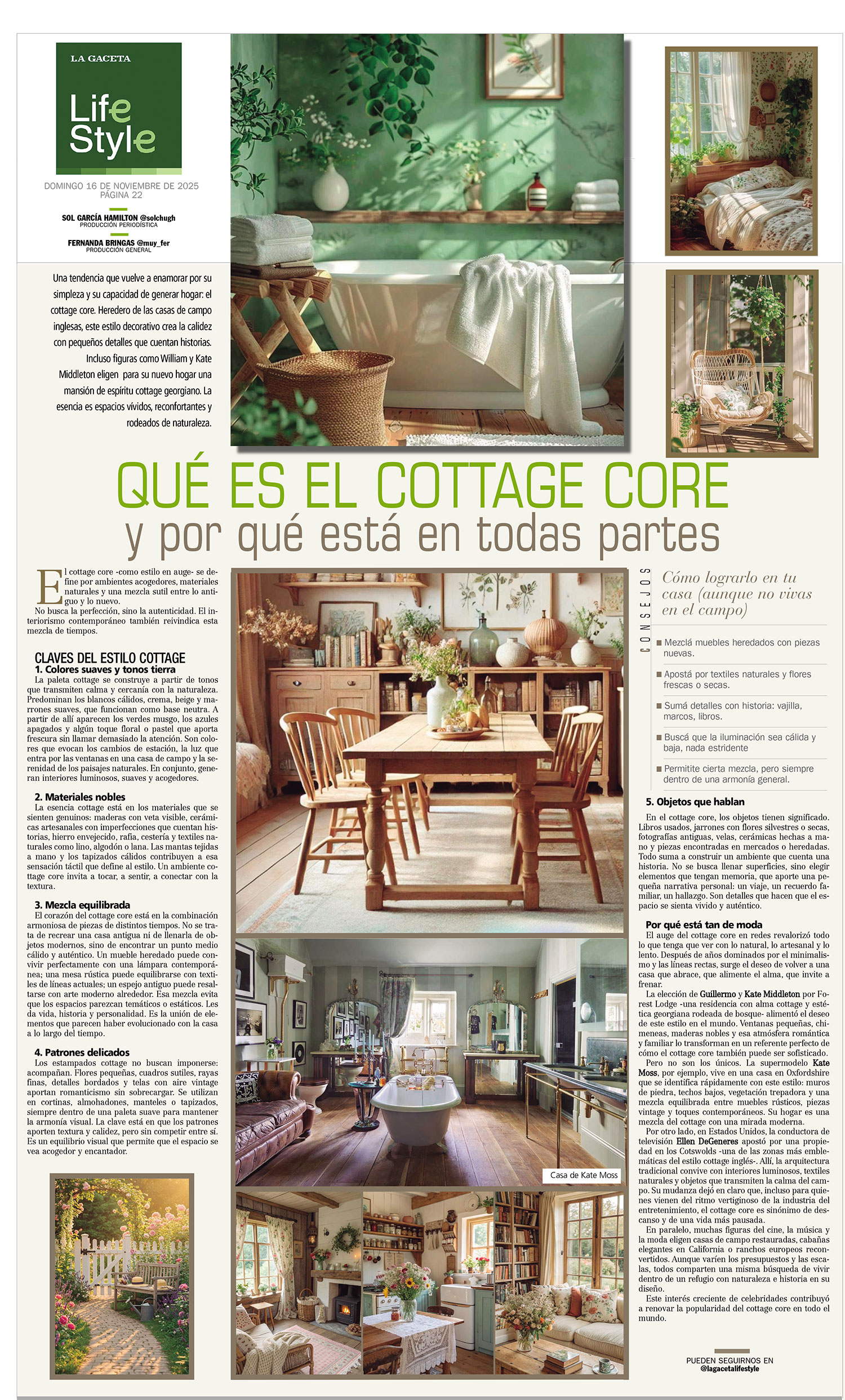 Una tendencia que vuelve a enamorar por su simpleza y su capacidad de generar hogar: el cottage core. Heredero de las casas de campo inglesas, este estilo decorativo crea la calidez con pequeños detalles que cuentan historias. Incluso figuras como William y Kate Middleton eligen para su nuevo hogar una mansión de espíritu cottage georgiano. La esencia es espacios vividos, reconfortantes y rodeados de naturaleza.