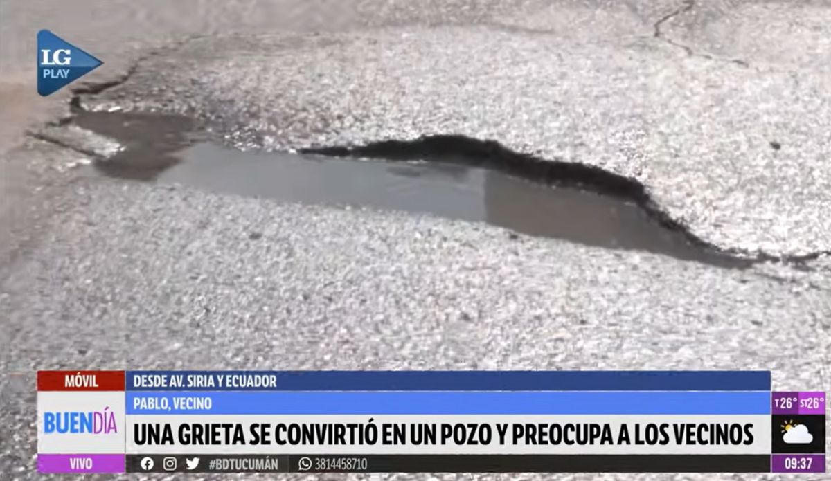 El reclamo llegó a través de un vecino que decidió comunicarse con LA GACETA para visibilizar la situación. “Comenzó con una pequeña fisura de agua, se hizo más grande, más grande y después empezó a caer el asfalto. Es un peligro porque mucha gente viene en dirección al centro y no lo ve”, explicó Pablo en una charla con Buen Día, de LG Play..
