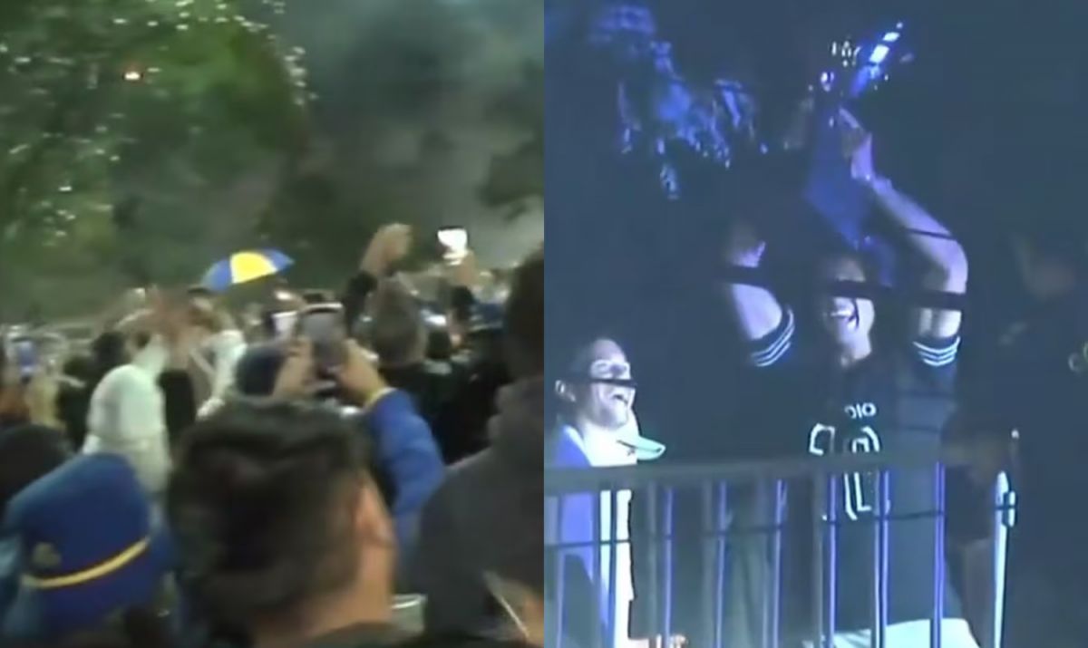 La celebración se desarrolló bajo la lluvia, con cánticos, banderas y un ambiente de euforia. Desde el balcón de la sede, los jugadores compartieron el momento con su gente: cantaron, saludaron y acompañaron el festejo desde lo alto.