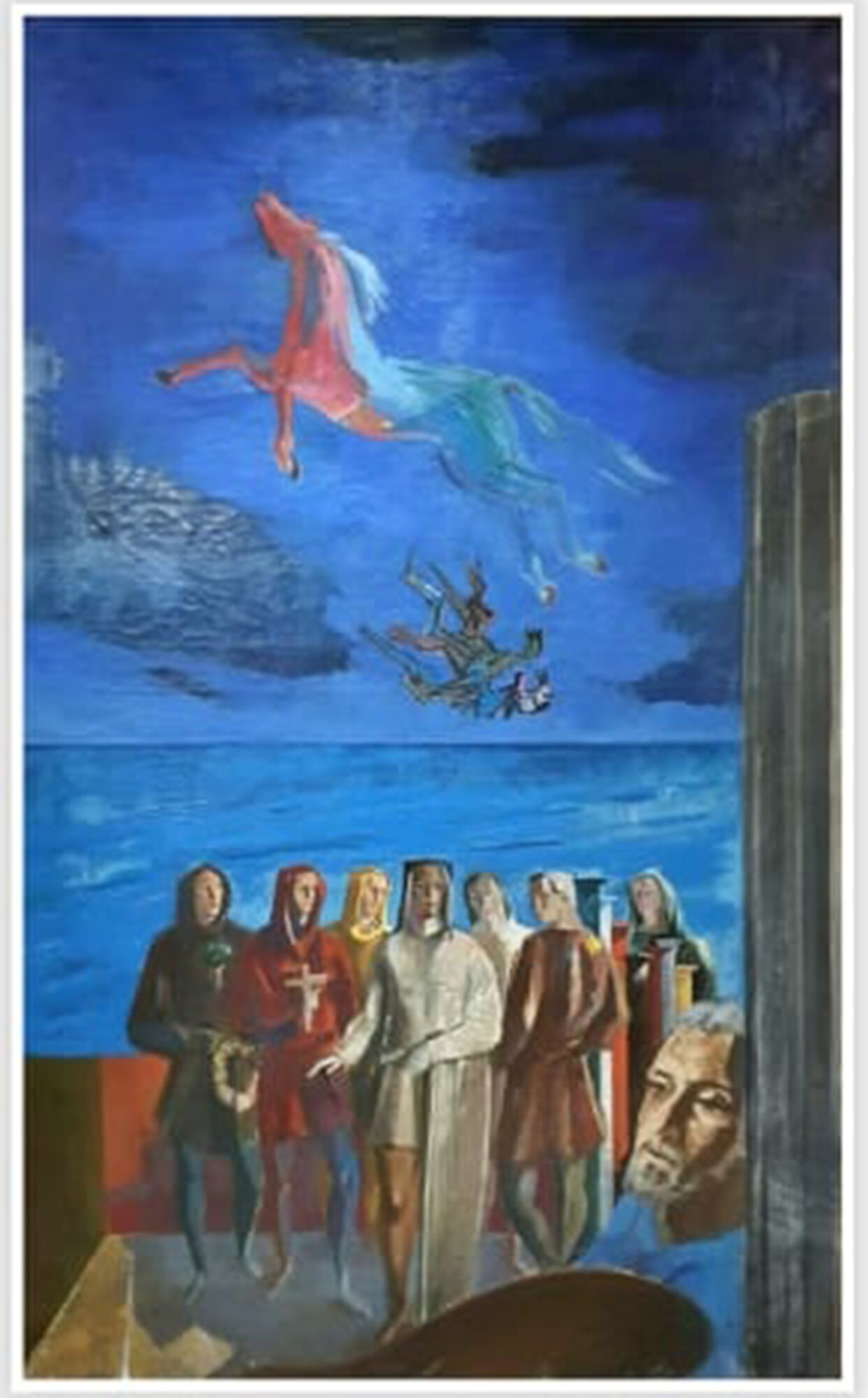 “RAPTO”. Una de las obras donadas. El pintor se retrató (a la derecha).