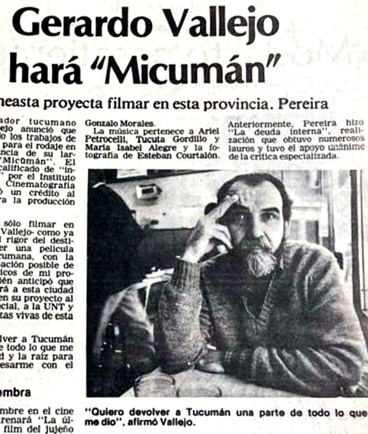 Esa mirada afectiva ha atravesado siempre el nombre de la provincia. Desde Ricardo Jaimes Freyre que antes de despedirse, en 1921, dijo “Nunca fui más feliz que en Tucumán” (ver “Recuerdos fotográficos” del 25/11) hasta Gerardo Vallejo, que en una entrevista del 20/10/1991 dijo que quería hacer una película llamada “Micumán”. “Quiero devolver a Tucumán parte de todo lo que me dio”, afirmó. El realizador, fallecido en 2007, expresó eso en el filme “Desde el alma”, de 1994.