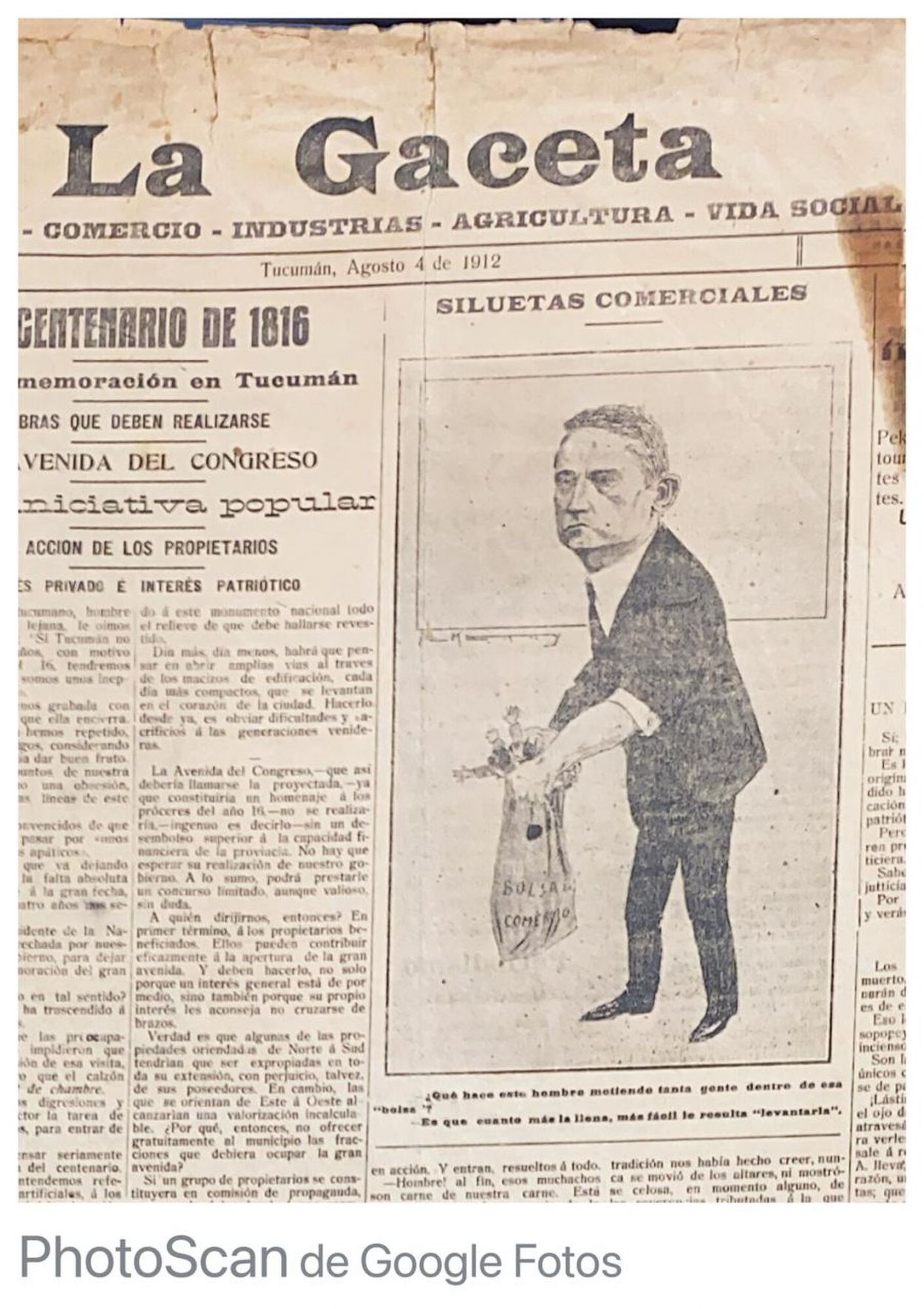 La imagen es un dibujo que muestra un hombre con una bolsa que dice “comercio” dentro de la cual pone personas, bajo el título “Siluetas comerciales” y una leyenda que dice: “-¿Qué hace este hombre metiendo tanta gente dentro de esa ‘bolsa’? -Es que cuanto más la llena, más fácil le resulta levantarla”. La alusión al crecimiento acelerado del comercio, a través de un dibujo alegórico, se vería también en el Censo de la Capital de Tucumán de 1913 que realizó Paulino Rodríguez Marquina, publicado en 1914, que detalló población, industria y comercio de la ciudad, y que remarcó con ilustraciones la preponderancia del comercio sobre la industria.